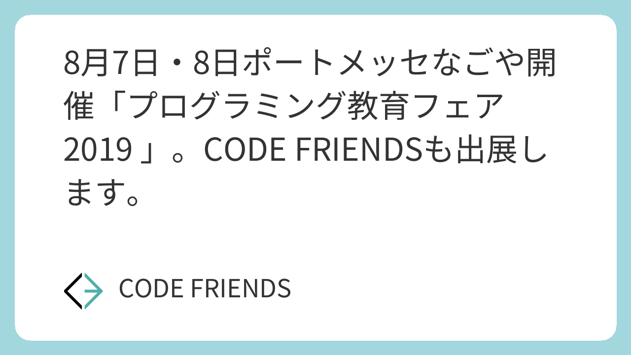 【第1回プログラミング教育フェア2019】 開催日時 : 8月7日(水)・8日(木)10:00~17:00 開催場所 : ポートメッセなごや イベントホール〔名古屋市港区金城ふ頭2-2〕 入場料 : 無料 *登録入場制
