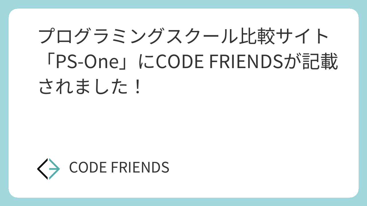 プログラミングスクール比較サイト「PS-One」にCODE FRIENDSが記載されました! お知らせ 2021.01.26 プログラミング教室が比較できるサイト「PS-One」様に、記載されています! コチラ から見ることができます! CODE FRIENDSをご検討の方は、ぜひ体験会や見学会にお越しください!